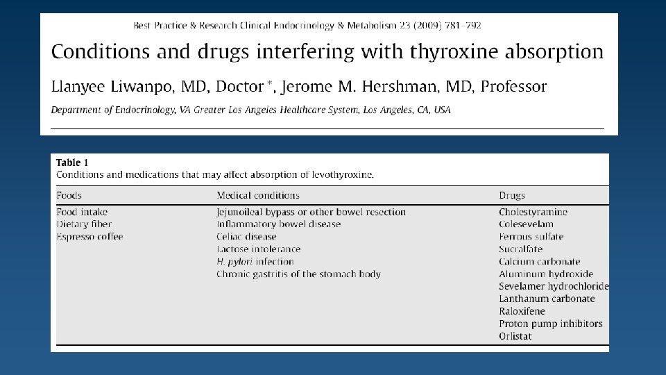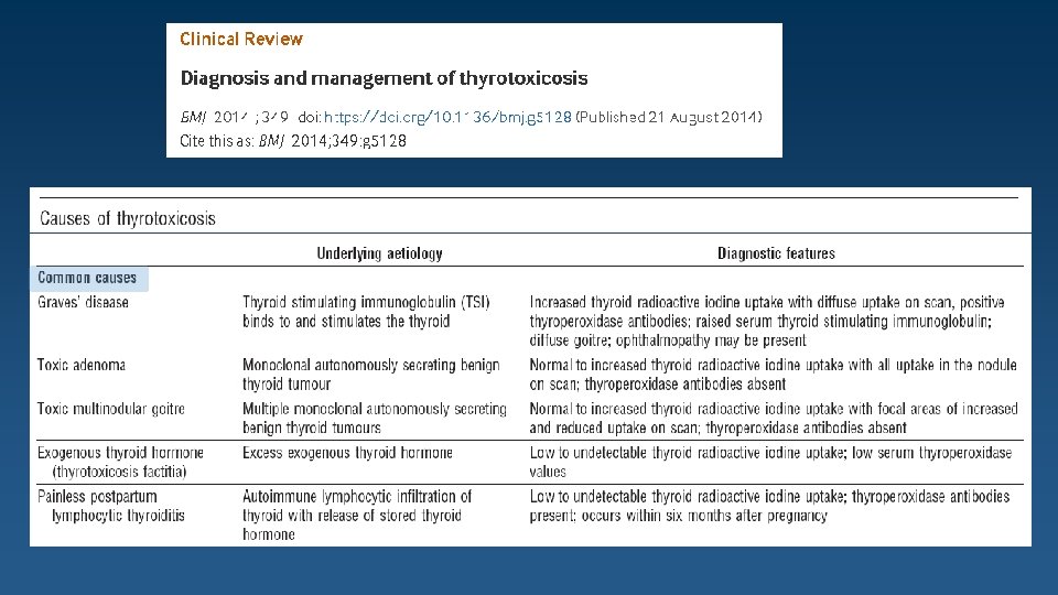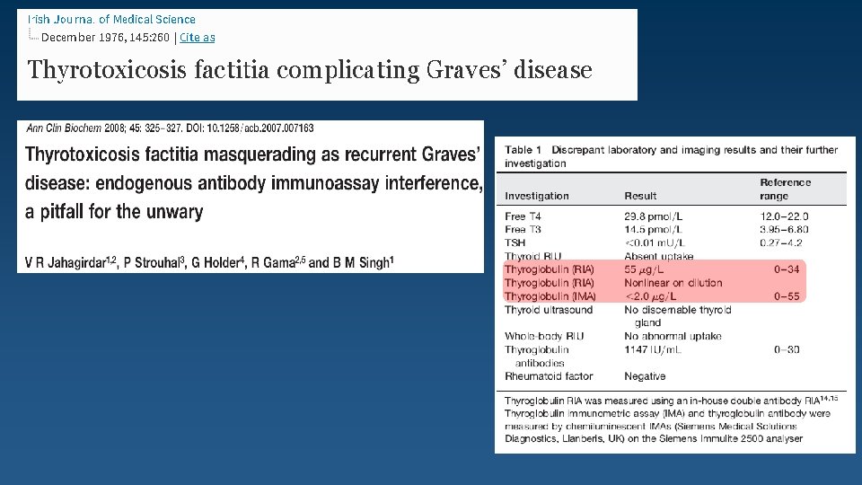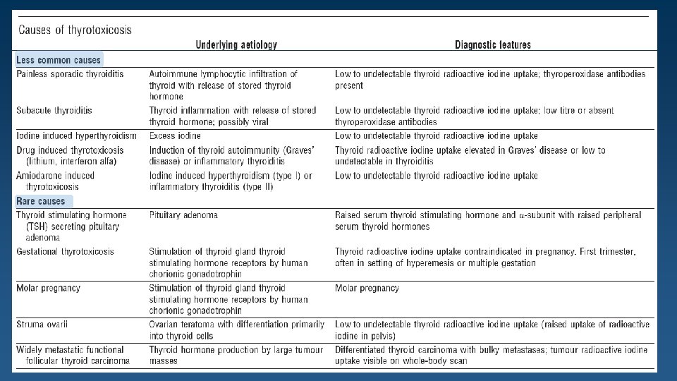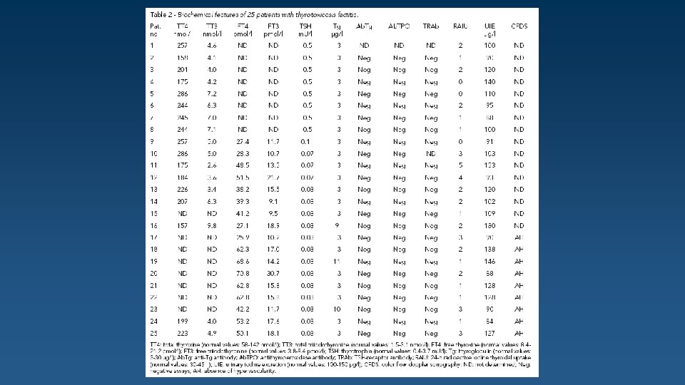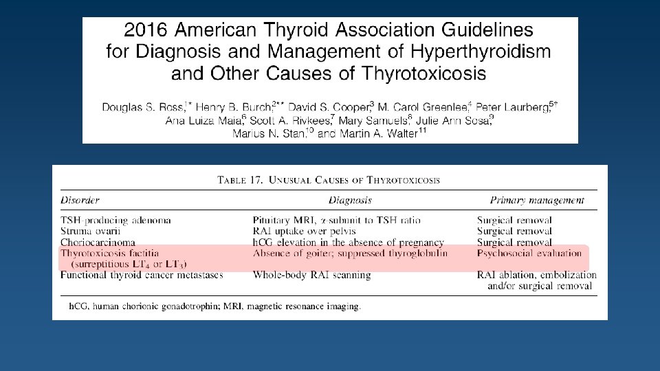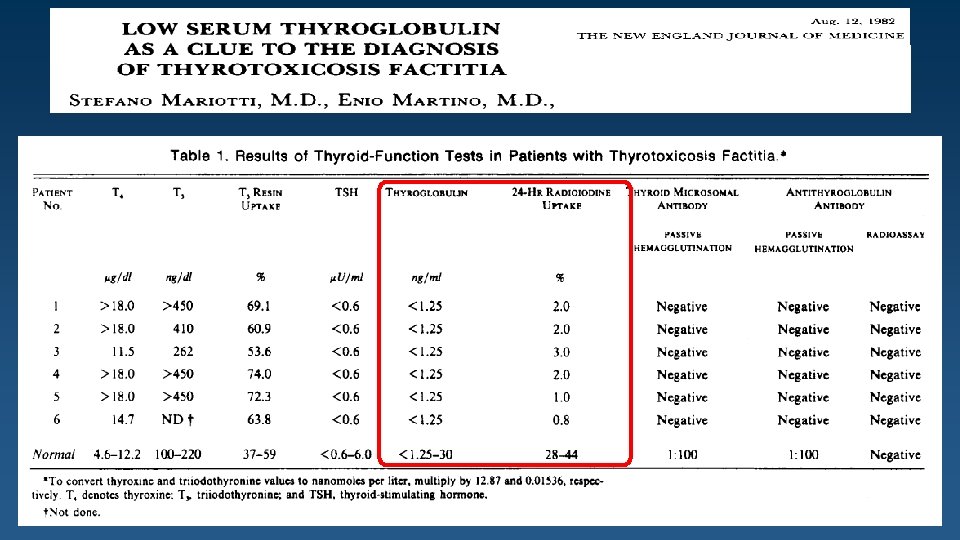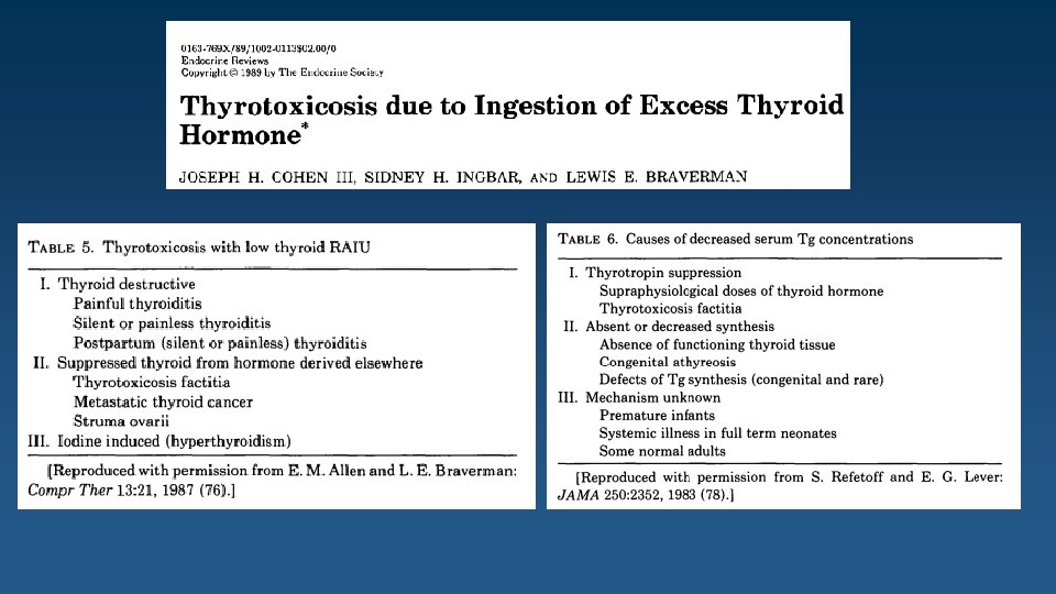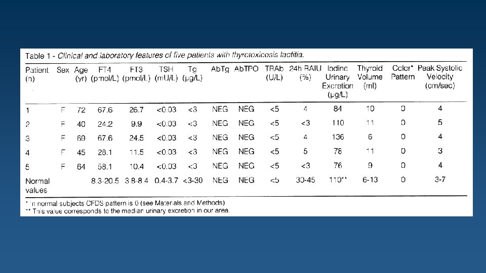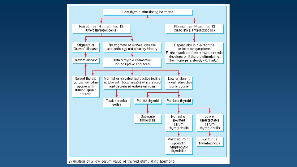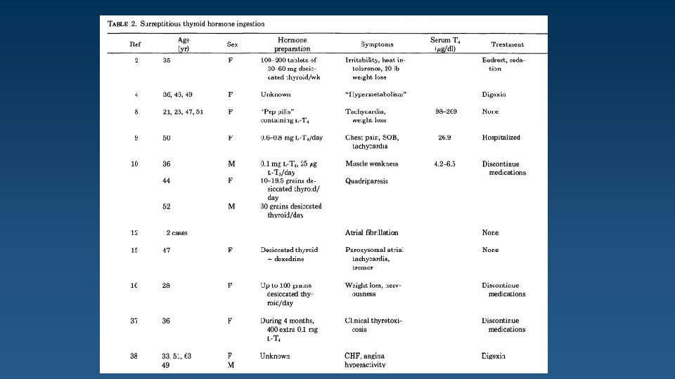 Thyrotoxicosis factitia Clues to this diagnosis : Absence of goiter Suppressed serum TG Decreased RAIU Distinction between painless thyroiditis and factitious thyrotoxicosis in Anti TG Positive : Elevated levels of T 4 A high T 4/T 3 ratio (with exogenous levothyroxine) A small thyroid A low thyroidal RAIU Thyroid ultrasound may be helpful painless thyroiditis: The thyroid has a heterogeneous echo Normal sized or slightly enlarged Ingesting thyroid hormone : Small with a normal echo Fecal levothyroxine A disproportionately elevated T 3 level suggests that the patient may be ingesting Liothyronine or a combination T 4/T 3 preparation.