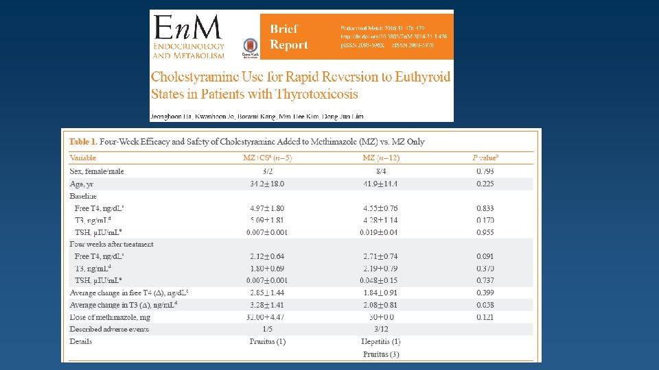 Patient History The patient was treated with Cholestyramine 4 gr. QID for 2 months. Lab. Results TSH : 0. 8 m. IU/L f. T 4 : 1. 2 ng/d. L T 3 : 110 ng/d. L ?