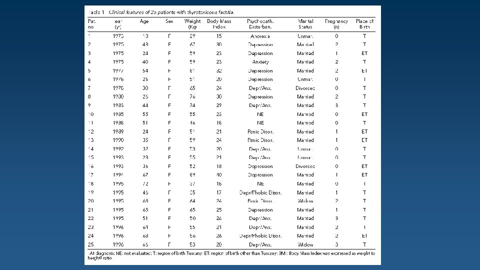 All 25 patients were women. Analysis was restricted to 17 patients who were born and lived in Tuscany (our region). Diagnosis of thyrotoxicosis factitia was based on the following parameters: Elevated serum total and/or free thyroid hormone levels Undetectable serum thyrotropin levels Low/undetectable serum thyroglobulin concentration Normal urinary iodine excretion Low/suppressed thyroidal RAIU Absence of goiter Absence of circulating anti-thyroid antibodies. Age at diagnosis was >50 yr. in 7/17 patients (41%). Patients older than 60 yr. were 5/17 (29%).