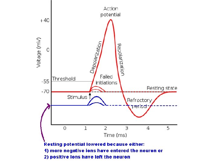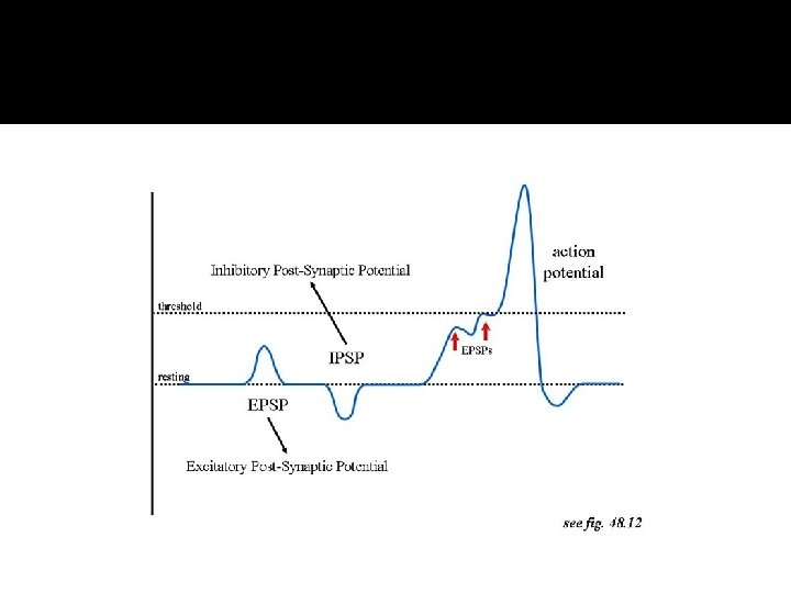 EPSP �If the post synaptic neuron was originally at a resting potential of -70 m. V, when Na+ enters the neuron, the membrane potential increases to become close to zero (it’s depolarized!) �If threshold levels are reached, this is the generation of an action potential in the post synaptic neuron and thus the transmission of a nerve impulse from one neuron to another