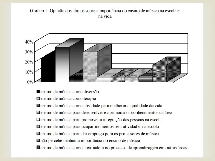• A prática pedagógica buscou priorizar nas práticas de ensino realizadas, principalmente, a execução instrumental de músicas brasileiras, bem como a realização de ditados rítmicos e a abordagem de alguns conteúdos e conceitos musicais elementares. • Haviam na sala alguns estudantes com algum conhecimento musical, que tocavam algum instrumento; • Ao final do curso houve a necessidade de saber doa alunos como as aulas de musica haviam tocado em suas vidas.