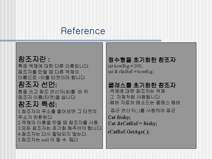 Reference Example 1 #include<iostream. h> class Smple. Cat { public: // 범용접근 제한자 Simple. Cat(int age, int weight); ~Simple. Ct(){} int Get. Age( ){return its. Age; }//inline int Get. Weight( ); private: // 전용접근 제한자 int its. Age; int its. Weight; }; Simple: : Simple. Cat(int age, int weight) { its. Age = age; its. Weight = weight; } int Simple. Cat: : Get. Weight() { return its. Weight; } void main { Simple. Cat Frisky(5, 8); // 객체변수를 r. Cat 참조자로 선언 Simple. Cat &r. Cat = Frisky; cout<<“Frisky is: ”; cout<<Frisky. Get. Age()<<“years old. n”; cout<<“And Frisky weights: ”; // < 참조자를 사용하여 함수를 호출> cout<<r. Cat. Get. Weight()<<“Pounds. n”; }