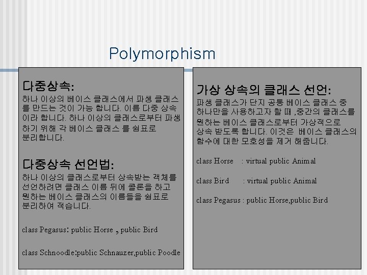 Polymorphism Example 1 #include<iostream. h> Class Horse{ public: // 범용접근 제한자 Horse(){cout<<“horse constructor. . ”; } virtual ~Horse(){cout<<“Horse destructor. . n”} virtual void Whinny()const{cout<<“Whinny!. ”; } private: // 전용접근 제한자 int its. Age; }; class Bird{ public: Bird(){cout<<“Bird condstuctor. . ”; } virtual ~Bird(){cout<<“bird destruntor”; } virtual void chirp()const{cout<<“chirp. . ”; } virtual void Fly()const{Cout<<“I can Fly!”; } private: int its. Weight; }; class Pegasus: public Horse, public Bird { // 다중 상속 public: void Chirp()const{Whinny(); } Pegasus(){cout<<“Pegasus constructor. . ”; } ~Pegasus(){cout<<“Pegasus destructor. . ”; } }; const int Magic. Number =2; void main() { Horse * Ranch[Magic. Number]; Bird* Aviary[Magic. Number]; Horse * p. Horse; Bird* p. Bird; int choice; for(int i = 0 ; i<Magic. Number ; i++) { cout<<“n(1)Horse(2)Pegasus: ”;