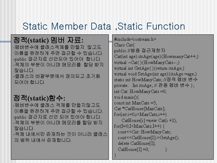 Static Member Data , Static Function Example #include<iostream. h> Class Cat { public: // 범용 접근 제한자 Cat(int age): its. Age(age){How. Many. Cats++; } virtual ~Cat(){How. Many. Cat--; } virtual int Get. Age(){return its. Age; } virtual void Set. Age(int age){ its. Age=age; } // <정적 멤버 함수> static int Get. How. Many(){return How. Many. Cats; } private: // 범용 접근 제한자 int its. Age; static int How. Many. Cats; // 정적 멤버 변수 }; int Cat: : How. Many. Cats =0; void Telepathic. Funciton(); //원형 함수선언 void main() { const *Cat. House[Max. Cats]; for(int I=0; I<Max. Cats; I++) { Cat. House[I] =new Cat(I+2); Telepathic. Function(); } for(I=0; I<Max. Cats; I++) { delete Cat. House[I]; Telepathic. Function(); Cat. House[I] =0; } } void Telepathic. Funtion() //정의 함수 { cout<<Cat: : Get. How. Many(); }