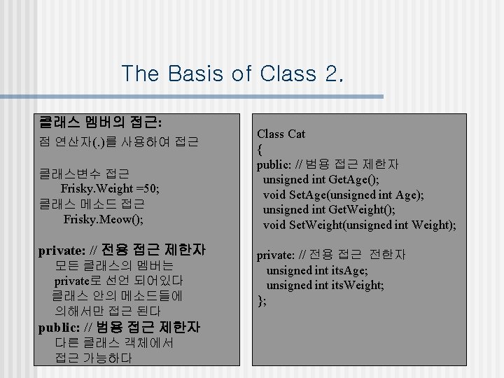 The Basis of Class 4. #include<iostream. h> Class Cat { private: // 전용 접근 제한자 int its. Age; public: // 범용 접근 제한자 Cat(int initaial. Age); ~Cat(); int Get. Age(){return its. Age; } // inline void Set. Age(int age); void Meow(){cout<<“Meow”; } }; Cat: : Cat(int inital. Age) // 생성자 { its. Age= initial. Age; } Cat: : ~Cat() //소멸자 { } Cat: : Set. Age(int age) // 클래스 메소드 { its. Age = age; } void main() { Cat Frisky(5); // 객체를 생성, 생성자 함수 호출 Frisky. Meow(); //객체의 함수호출 cout<<“Frisky is a cat who is “; cout<<Frisky. Get. Age()<<“year”; Frisky. Mewo(); Frisky. Set. Age(7); cout<<“Now Frisky is”; cout<<Frisk. Get. Age()<<“Year”; }