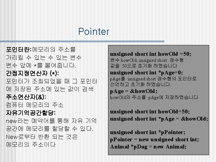 Pointer Example #inclue<iostream. h> class Simple. Cat {private: // 전용접근 제한자 int *its. Age; //정수형 포인터 int *its. Weight; public: // 범용접근 제한자 Simple. Cat(); // 생성자 ~Simple. Cat(); // 소멸자 int Get. Age()const{return *its. Age; } void Set. Age(int age); int Get. Weight( )const; }; Simple. Cat: : Simple. Cat() { its. Age = new int(2); its. Weight= new int(5); } Simple. Cat: : ~Simple. Cat() { delete its. Age; delete its. Weight; } Simple. Cat: : Set. Age(int age) { *its. Age = age; //포인터에 age를 할당한다. } Simple. Cat: : Get. Weight()const { return *its. Weight; //포인터를 반환 값으로 가진다 } void main() { Simple. Cat *Frisky = new Simple. Cat; //객체포인터 cout<<(*Frisky). Get. Age(); //포인터를 사용한 함수 호출 1 Frisky –>Set. Age(5); //포인터를 사용한 함수 호출 2 cout<<Frisky –>Get. Age(); delete Frisky; }