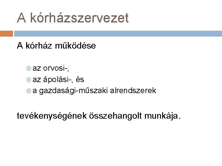A kórházszervezet A kórház működése az orvosi-, az ápolási-, és a gazdasági-műszaki alrendszerek tevékenységének összehangolt munkája.