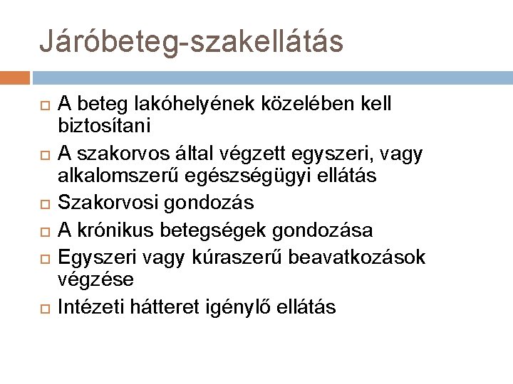Járóbeteg-szakellátás A beteg lakóhelyének közelében kell biztosítani A szakorvos által végzett egyszeri, vagy alkalomszerű egészségügyi ellátás Szakorvosi gondozás A krónikus betegségek gondozása Egyszeri vagy kúraszerű beavatkozások végzése Intézeti hátteret igénylő ellátás