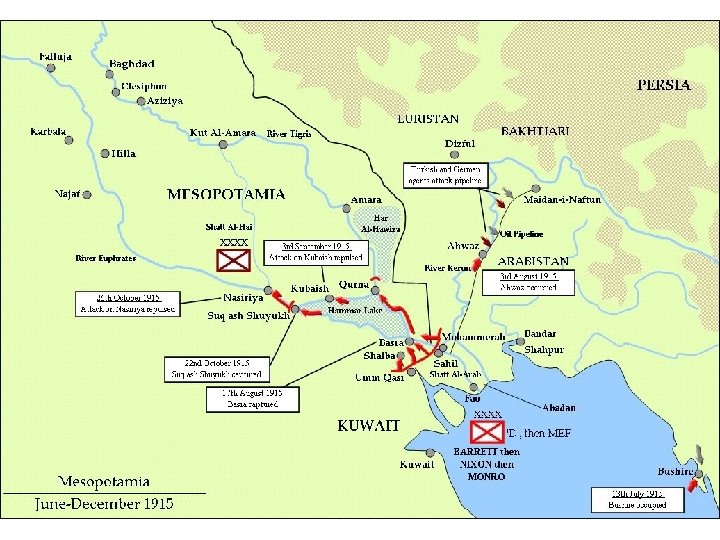 Specific battles, revolts, or other events that took place during WWI: • The Mesopotamia Campaign 1914 – WWI in the region later known as Iraq – The Fao Landing (Al Faw) November, 1914 British offensive begins • small port in modern Iraq near the Shatt al-Arab and the Persian Gulf • Battle of Shaiba – April 12 -14 1915 – Push toward Bagdad – British Success • The Siege of Kut/ The Battle of Kut – Dec. 7 1915 – April 29 1916 – British attempt at push toward Bagdad – British surrender (humiliating) • Capture Bagdad 1917 Armistice of Mudros signed 1918 – March 1917 – Proclamation of Bagdad – General Maude “our armies do not come into your cities and lands and conquers or enemies, but as liberators”