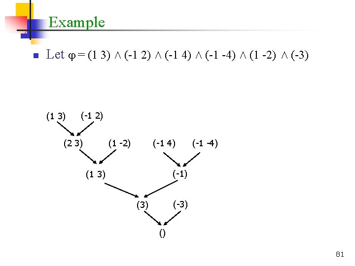 Resolution n n Resolution is a sound and complete inference system for CNF If the input formula is unsatisfiable, there exists a proof of the empty clause 80
