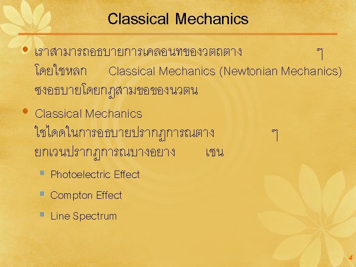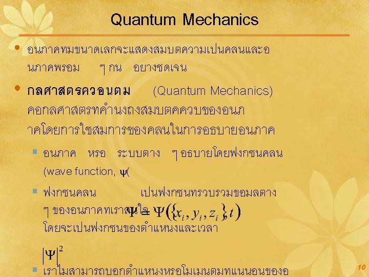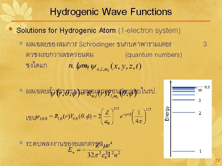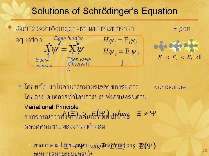 Schrödinger's Equation Erwin Schrödinger เสนอสมการทใชในการหาฟงกชนคลน § Time-dependent Schrödinger Equation § Time-independent Schrödinger Equation Kinetic Energy Operator § Hamiltonian Operator Potential Energy Operator § E คอพลงงานของระบบ คำตอบทไดจากการแกสมการ คอฟงกชนคลน ( ) Schrödinger 11