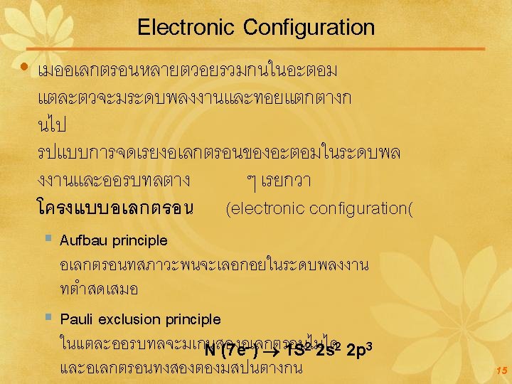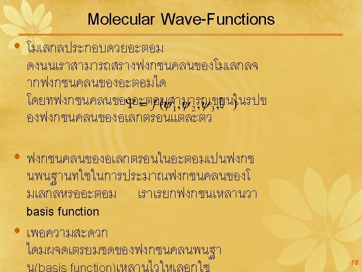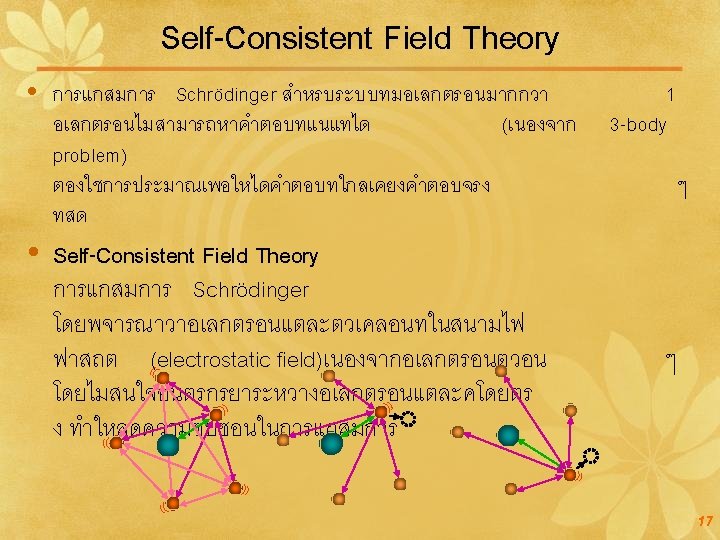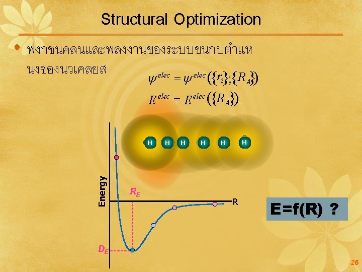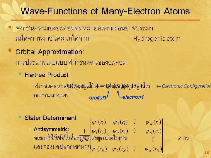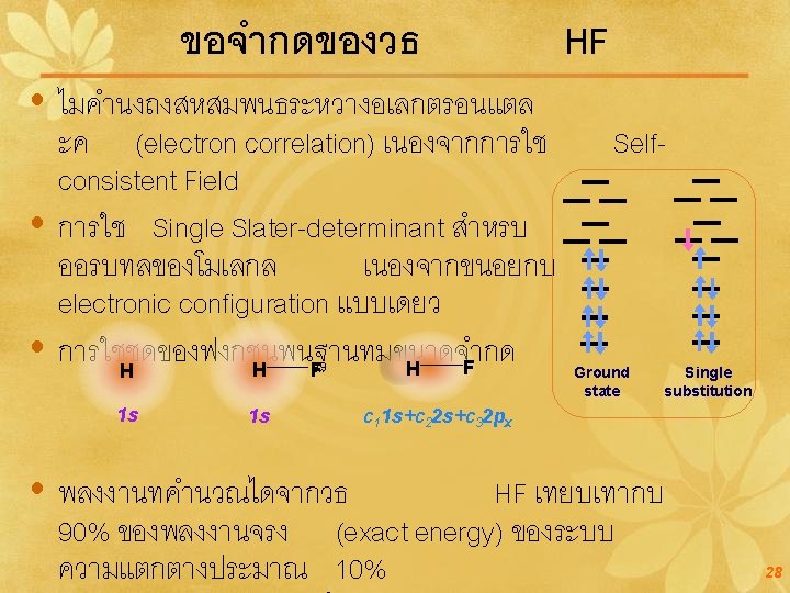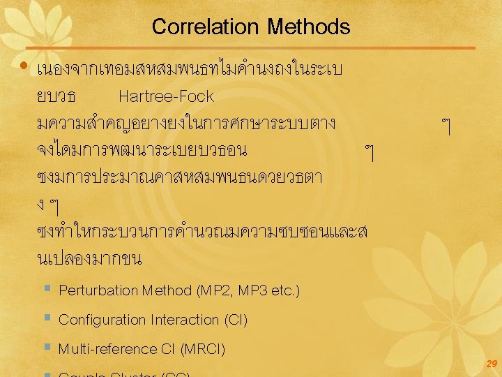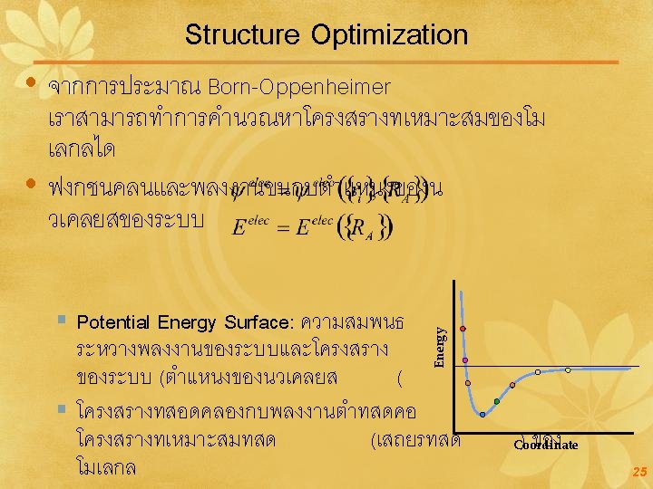 Roothann-Hall Equation เมอใช LCAO-MO กบสมการ Schrödinger จะไดสมการ Roothann-Hall § สมการ Roothann-Hall สามารถเขยนในรปสมการ matrix 2 -electron integral • • : the energy of a single electron in the field of the bare nuclei : the density matrix; § สมการ Roothann-Hall เปนแบบ non-linear และสามารถแกโดยใชการประมาณ Self-consistent Field 24