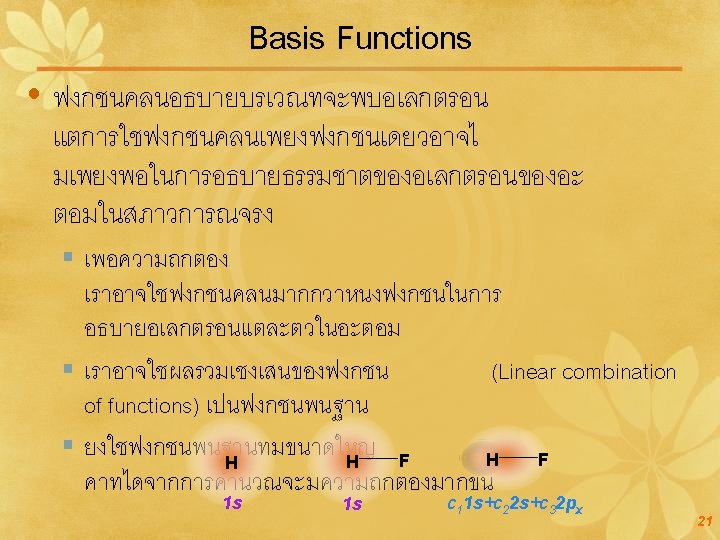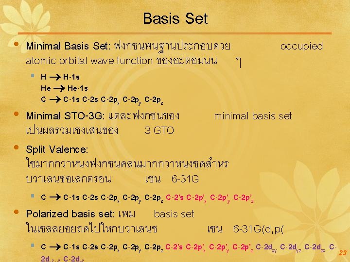 Linear Combination of Atomic Orbital (LCAO) ฟงกชนคลนของโมเลกลสามารถเขยนไดในรปของ ผลบวกเชงเสนของฟงกชนพนฐาน (basis functions( orbital coefficients ฟงกชนพนฐาน (basis functions( § Slater-type orbitals (STOs) : ถกตอง § Gaussian-type orbitals (GTOs) : สะดวก § Contracted GTO (CGTOs or STO-n. G) : ถกตองและสะดวก 22