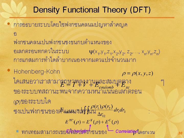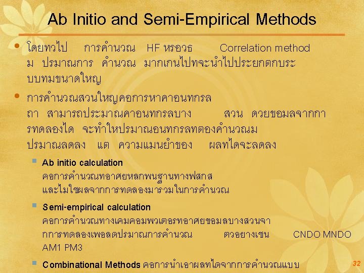 Density Functionals เทอม และ สามารถประมาณไดจากฟงกชนนลแบบตาง § Local exchange functional (uniform electron gas) ๆ § Beck 88 exchange functional § Gradient-corrected correlation functional Hybrid Method § B 3 LYP 31