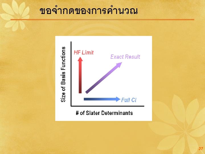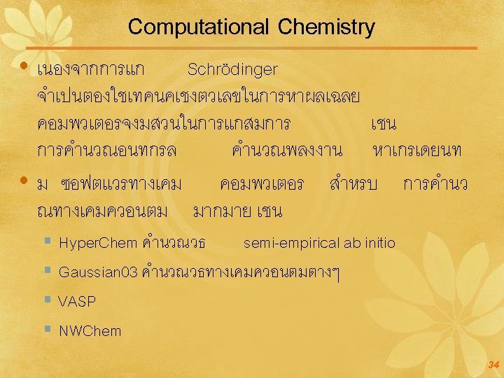 Information from Quantum Calculation Molecular Properties § โครงสราง (ความยาวพนธะ มมพนธะ ฯลฯ( § ความหนาแนนอเลกตรอน และ dipole moment § พลงงาน เอนทาลป Spectroscopy Properties § IR, NMR, UV spectra More rigorous Information § ระดบพลงงาน § ออรบทล Reaction Energy Thermodynamics & Kinetics properties 35