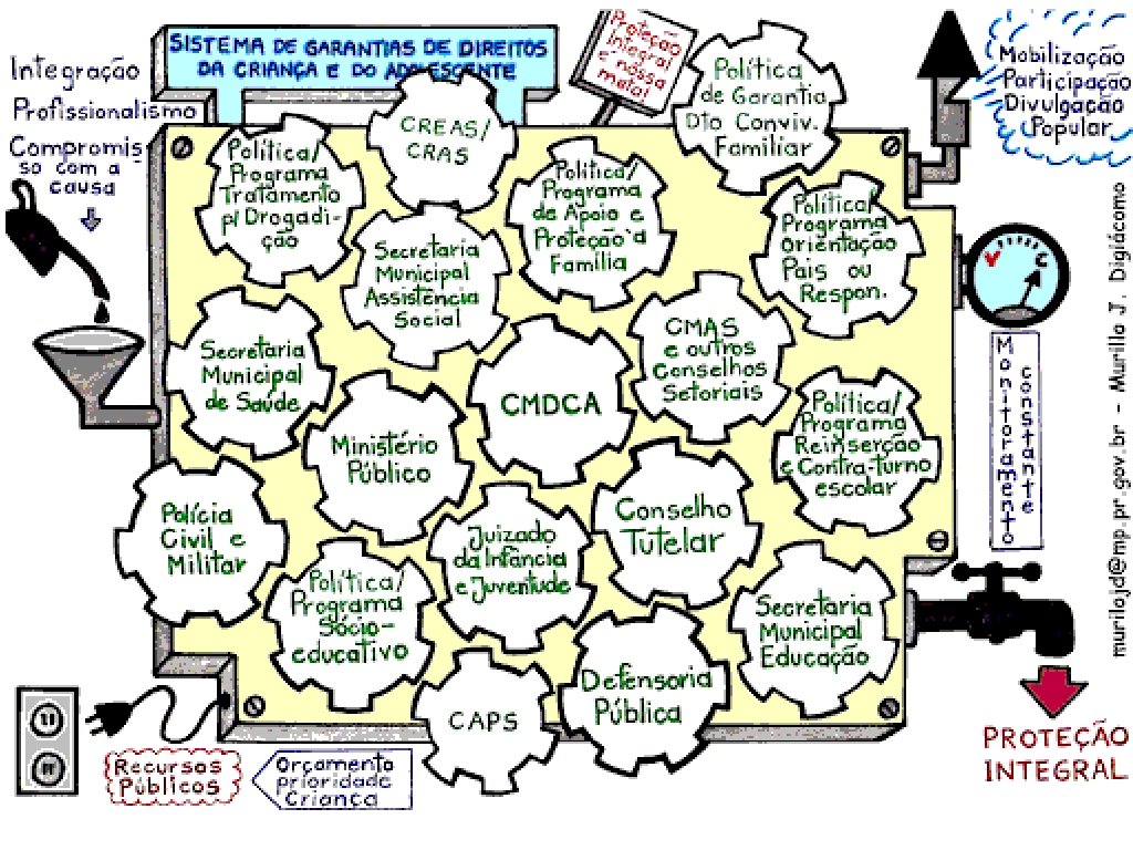 Em busca da garantia dos Direitos da Criança e do Adolescente. . . constitui-se na articulação e integração das instâncias públicas governamentais e da sociedade civil, na aplicação de instrumentos normativos e no funcionamento dos mecanismos de promoção, defesa e controle para a efetivação dos direitos da criança e do adolescente, nos níveis Federal, Estadual, Distrital e Municipal. Sistema de Garantia de Direitos da Criança e do Adolescente 204 CEF 227 diretrizes para ações governamentais na área da assistência social à família, à sociedade e ao Estado o dever de promover e garantir os direitos humanos fundamentais a cada criança e adolescente.