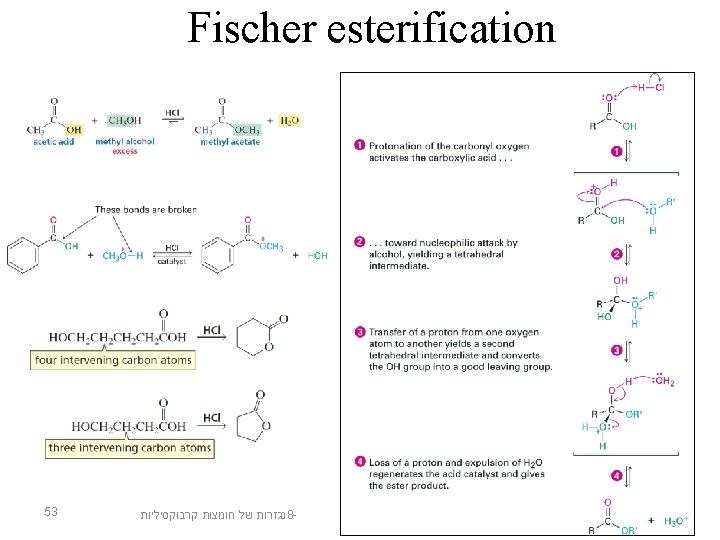 Reaction of a Carboxylic Acid with an Alcohol The reaction is catalyzed by acids. Excess alcohol drives the reaction to the right. נגזרות של חומצות קרבוקסיליות 8© 2014 Pearson Education, Inc. 52