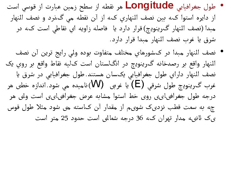Ø Longitude is comprised of meridians that form one-half of a circle, or plane. Ø Meridians are designated by their angle west or east of the prime meridian. Ø The prime meridian is designated 0º and extends from the north pole to the south pole through Greenwich, England. Ø Meridians are angled, and do not parallel each other. Ø The linear distance between one degree of longitude at the equator is approximately 69 statute miles. Ø The linear distance between one degree of longitude at the arctic circle is only about 26 statute miles