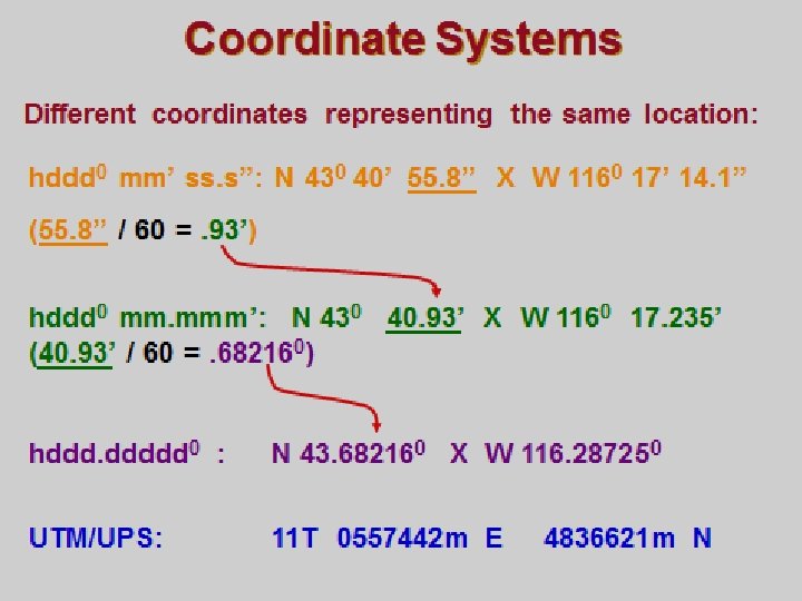 Think of coordinate systems as just another way of expressing a geographic location. For example, the intersection of Fifth Avenue and Main Street can also be described as “the corner where Floyd’s Barber Shop is located. ” These are merely two different ways of describing the same location. Similarly, that same geographic location can be identified using a variety of geographic coordinates, such as the UTM coordinates 17 S 0345678 E 4123678 N. Or, using latitude and longitude Floyd’s Barber Shop might be: N 40° 23’ 45” W 98° 12’ 06” (expressed in degrees, minutes and seconds). As for latitude and longitude, there are three to describe coordinates: degrees, minutes and seconds: N 40° 23’ 45” W 98° 12’ 06” degrees and decimal minutes: N 40° 23. 75’ W 98° 12. 1’ decimal degrees: N 40. 395° W 98. 201° Each of the above sets of coordinates represent the same location. To convert seconds to decimal minutes, divide the seconds by 60 to get decimal minutes. To convert decimal minutes to decimal degrees, divide the decimal minutes only by 60 to get decimal degrees. Universal Transverse Mercator (UTM) is different than latitude and longitude, so it looks and behaves differently. But it is still just another way of expressing the location of a point on a map or on the ground. The “UPS” included with UTM stands for “Universal Polar Stereographic”, a coordinate system that is a variation of UTM that is used in the north and south polar regions in place of UTM.