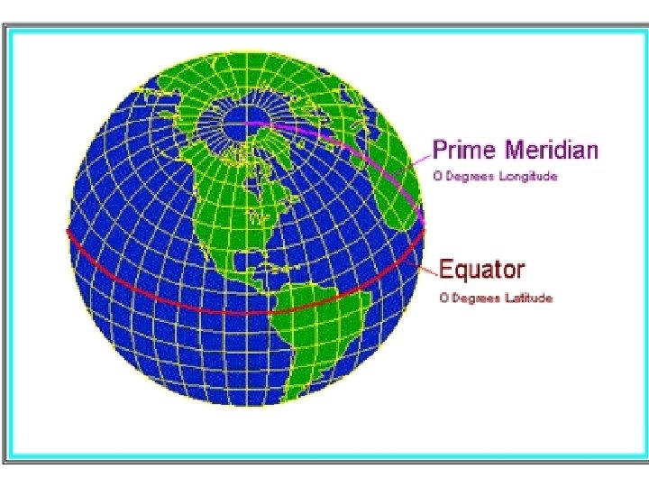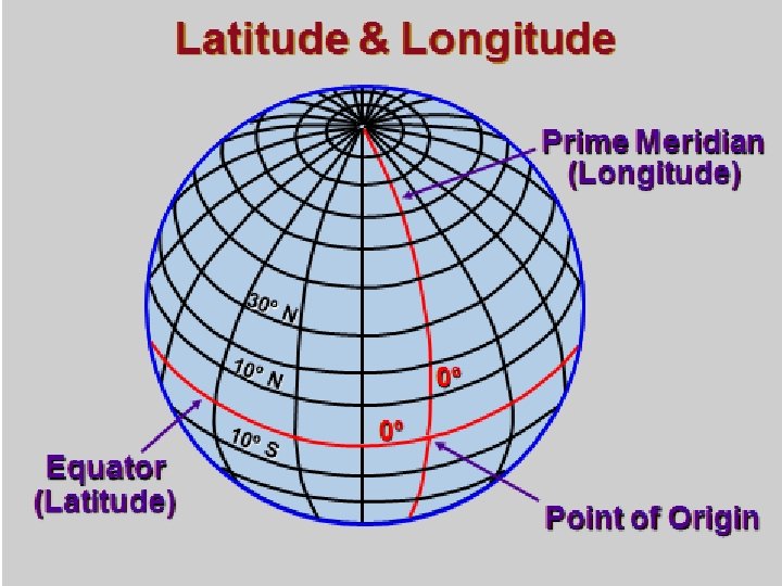 Latitude & Longitude (cont. ) The point of origin for latitude and longitude on the earth’s surface is where the Prime Meridian and the equator intersect. Geographically that point is just west of Africa in the South Atlantic Ocean.