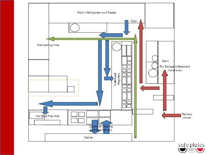 Flow of Food • The path food follows from storage to plating/service is important. • Flow should generally move from raw to service • Minimize chances that potentially contaminated ingredients, surfaces, and utensils contact prepared foods.