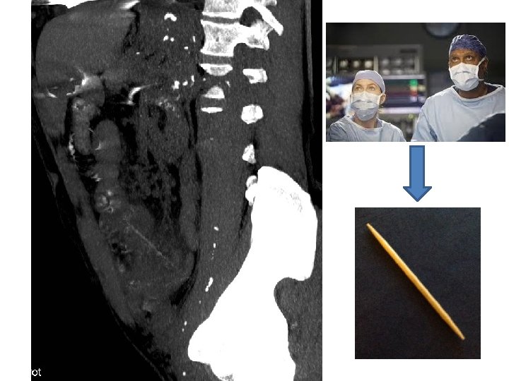 Mr T • Patient de 76 ans consultant aux urgences • Syndrome douloureux abdominal évoluant depuis 10 jours , majoration des symptômes depuis 3 jours • Fièvre à 38. 5°C, frissons et vomissements • Abdomen dépressible mais douloureux en fosse iliaque gauche • Hyper leucocytose à 17 000/mm 3, CRP à 115 Recherche de sigmoïdite