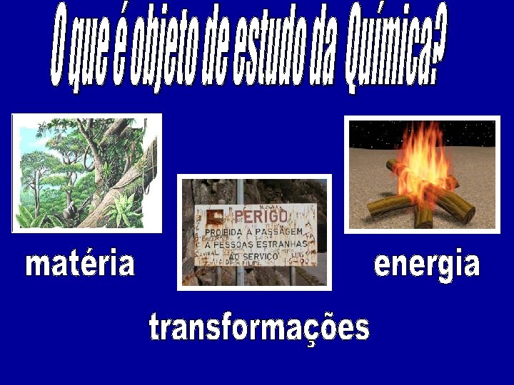 A ciência QUÍMICA está voltada para o estudo da matéria, qualquer que seja sua origem. Observando a composição da matéria, suas transformações e a energia envolvida nesses processos MATÉRIA É tudo que tem massa e ocupa um lugar no espaço CORPO OBJETO É uma porção É um corpo que tem limitada da matéria finalidade específica
