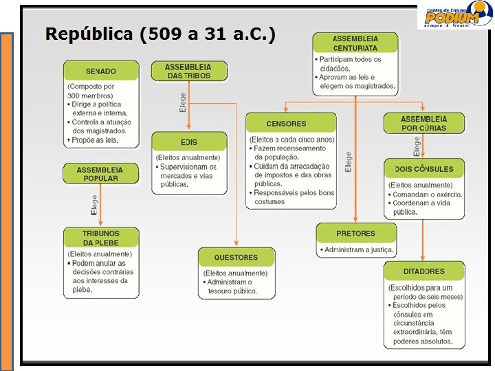 Estrutura Política • Consulado: composto por dois membros eleitos pela Assembleia Centurial para um mandato de um ano. Aos cônsules cabia apresentar projetos de lei, presidir o Senado e a Assembleia Centurial, chefiar o Exército; eram, na realidade, os dirigentes de Roma. • Senado: órgão mais importante e poderoso da administração republicana, ao qual tinham acesso somente os patrícios. Os senadores possuíam cargo vitalício; a principio eram apenas 300, mas depois passou para o numero de 600 • pretor, responsável pela aplicação da justiça; • censor, encarregado de recensear os cidadãos de acordo com critérios de riqueza, a fim de elaborar o álbum senatorial. Cuidava ainda da conduta moral dos cidadãos; • questor, responsável pelo tesouro público; • edis, encarregados da conservação da cidade (limpeza, policiamento, abastecimento de água e gêneros alimentícios, etc); • pontífice, responsável pelos assuntos religiosos.