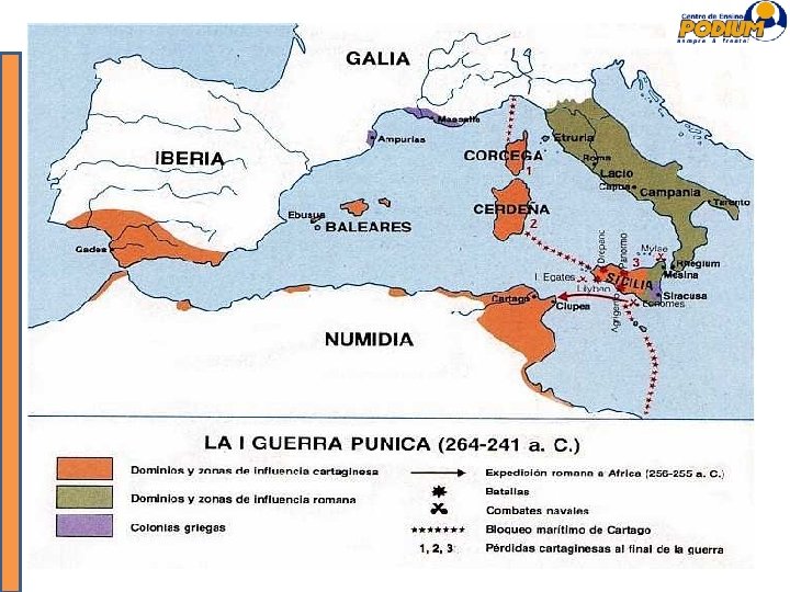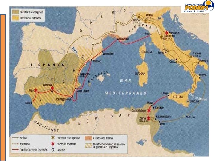 A REPÚBLICA ROMANA Conquistas territoriais 1ª fase: controle de toda Península Itálica 2ª fase: Guerra contra Cartago / Guerras Púnicas (256 -146 a. C) • Domínio sobre Cartago (ex-colônia fenícia / “punis” = fenícios) asseguraria controle do Mediterrâneo • 1ª etapa: submissão de Cartago ao pagamento de tributos • 2ª etapa: reação cartaginesa, invasão à Roma e posterior retomada romana até a reconquista de territórios e assinatura de rendição de Cartago • 3ª etapa: submissão completa e destruição da cidade de Cartago