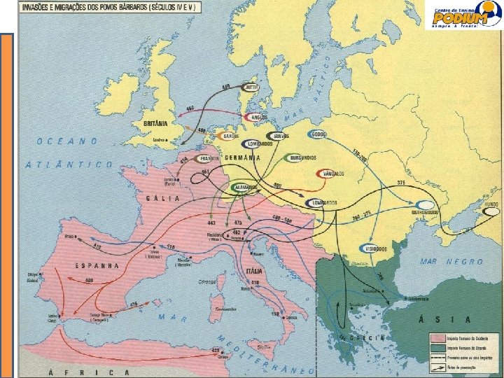 Exercícios de revisão Sidônio Apolinário, aristocrata da Gália romana, escrevendo a um amigo, num período de grandes transformações culturais, assim se expressou: O vosso amigo Eminêncio, honrado senhor, entregou uma carta por vós ditada, admirável no estilo [. . . ]. A língua romana foi há muito tempo banida da Bélgica e do Reno; mas se o seu esplendor sobreviveu de qualquer maneira, foi certamente convosco; a nossa jurisdição entrou em decadência ao longo da fronteira, mas enquanto viverdes e preservardes a vossa eloquência, a língua latina permanecerá inabalável. Ao retribuir as vossas saudações o meu coração alegra-se dentro de mim por a nossa cultura em desaparição ter deixado tais traços em vós [. . . ]. Apud PEDRERO-SÁNCHEZ, Maria Guadalupe. "História da Idade Média: textos e testemunhas". São Paulo: Editora UNESP, 2000. p. 42 -43. A opinião contida no fragmento da carta está diretamente relacionada às a) invasões dos territórios do Império Romano pelos povos germânicos, provocando mudanças nas instituições imperiais. b) influências da cultura grega sobre a latina após a conquista da Grécia pelos romanos e sua anexação ao Império. c) vitórias dos romanos sobre Cartago nas chamadas Guerras Púnicas (264 -146 a. C. ), impondo a cultura do Império a todo o norte da África. d) crises que se abateram sobre o Império Romano depois do governo de Marco 84 Aurélio (161 -180 d. C. ), quando o exército passou a controlar o poder.