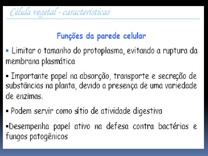Parede Celular Matriz extracelular, espessa, rígida e forte Exterior à Membrana Plasmática Forma à Célula Funcionalidade aos tecidos Rigidez e Flexibilidade