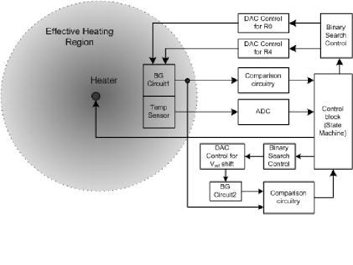 Heater: the dimension of the heater is quite small in comparison with that of the die. It is regarded as a point heat source. The shadow region is where the heater can effectively change the temperature of the die. BG Circuit and Temp Sensor are in the effective heating region. BG Circuit 1: the whole bandgap circuit includes bandgap structure, current mirror and the amplifier. R 0 and R 4 are both DAC controlled. BG Circuit 2: the backup BG reference circuit, the same structure as BG Circuit 1 but with only R 4 DAC controlled. Temp. Sensor: the temperature sensor, which can sense the temperature change instantaneously, is located close to the bandgap circuit and has the same distance to the heater as the bandgap circuit so that the temperature monitored represents the ambient temperature of the bandgap circuit. Need good temperature linearity. ADC: quantize analog outputs of the temperature sensor. Need 10 -bit linearity. Control Block: state machine is used as a controller, which receives the temperature sensing results and the comparison results and gives out control signals for binary search and heater. DAC Control for R 0 and R 4: provide the digital controls for R 0 and R 4 in bandgap structure. Binary Search: implement binary search for choosing right control signal for R 0 and R 4. Comparison Circuitry: compare the outputs of the bandgap outputs. It is capable of making a comparison differentially or single-ended between the bandgap outputs at two differential moments and two different temperatures. The comparison circuitry should be offset cancelled and have small enough comparison resolution (much higher than 16 -bit).