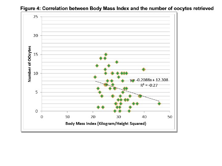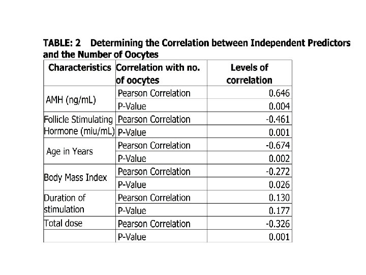 Characteristics Age Minimum Maximum Mean Std. Deviation 20 45 31. 3 6. 7 Parity 0 3 0. 5 0. 8 Weight 55. 2 117. 4 78. 8 13. 8 Height 1. 5 1. 8 1. 6 0. 1 BMI 20. 9 45. 9 29. 5 5. 2 FSH 2. 1 17. 8 5. 9 2. 6 LH 0. 3 17. 3 5. 2 3. 1 AMH 0 16. 6 3. 7 3. 0 AFC 1 22 10. 4 5. 5 before HCG 1 20 5. 5 3. 5 Number of Oocytes 0 20 7. 5 5. 2 Amp 2 6 3. 5 1. 4 Duration of Stimulation 4 15 9. 9 1. 7 Total Dose 300 5850 2583. 4 1136. 5 TABLE: 1 Characteristics of Subjects Number of Follicles ≥ 17 mm