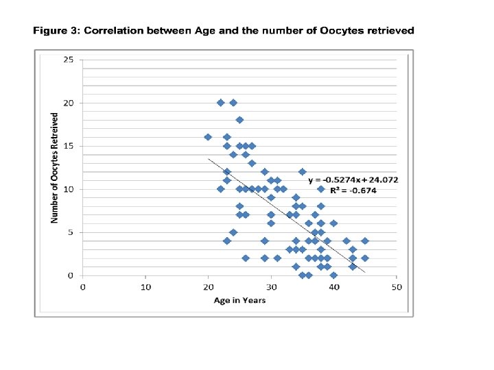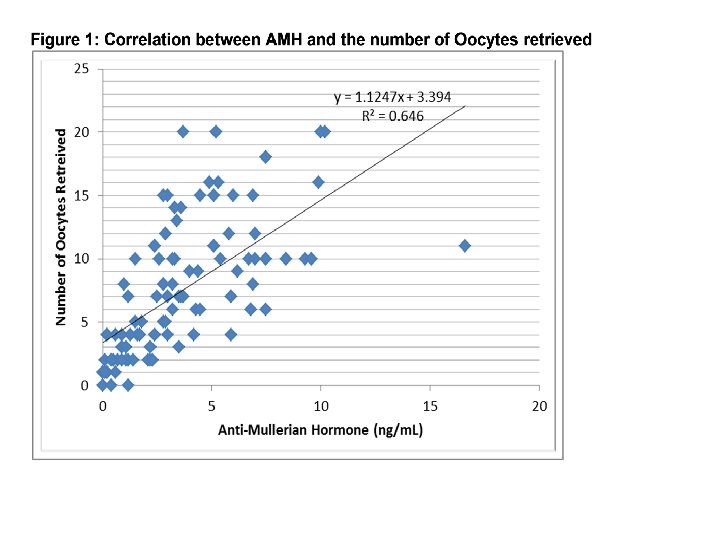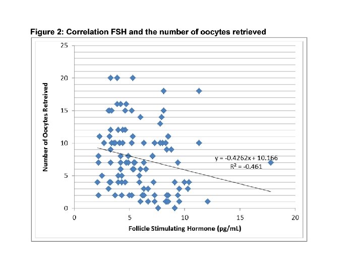 methodology • Stored basal menstrual cycle day three serum samples of 112 women was evaluated for AMH and FSH and compared to the number of oocytes retrieved • A correlation analysis, ROC curve and analysis of variance were performed to determine the level of accuracy between AMH and FSH in predicting the ovarian reserve and responsiveness