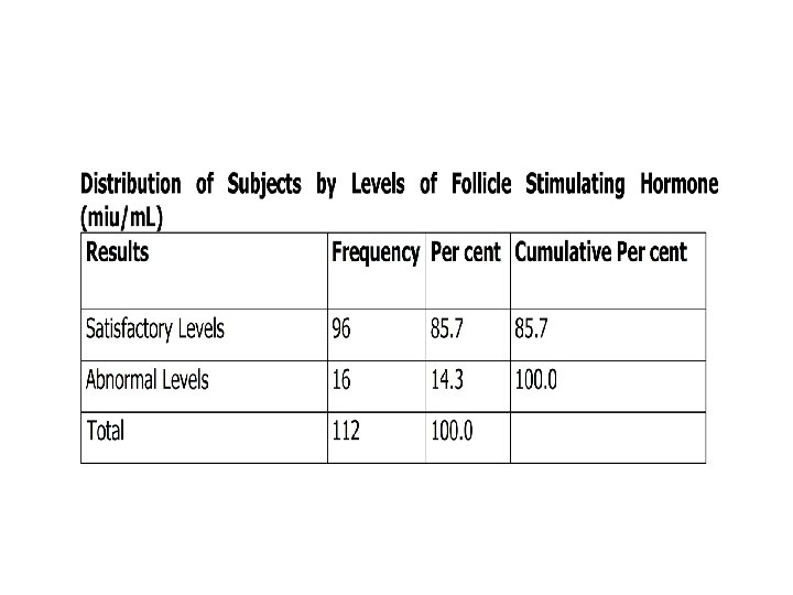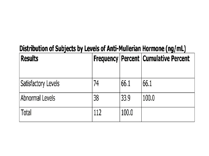 AMH/FSH • For the purpose of this study, serum AMH levels <2. 2 ng/ml shall be taken as an abnormal level while serum levels >2. 2 ng/ml is satisfactory. Serum FSH levels between 3 -10 miu/ml will be regarded as normal/satisfactory while levels >10 miu/ml will be regarded as abnormal