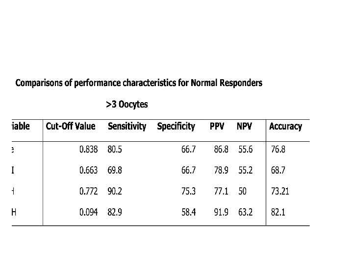 AMH/FSH • FSH show a higher level of sensitivity for levels of Oocyte >3 oocytes retrieved. Interestingly, AMH showed a higher overall accuracy (82. 1%) even for normal responders