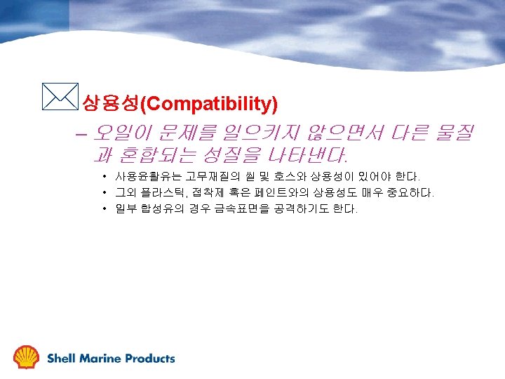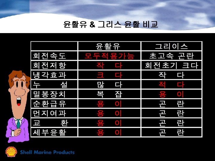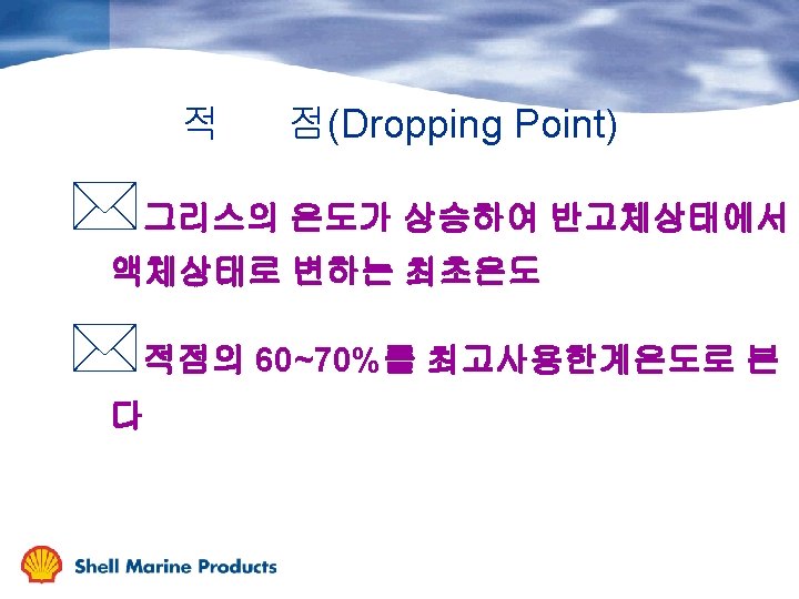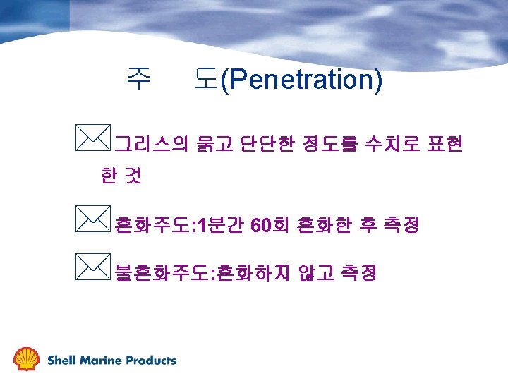 주 NLGI 액상 Class 고상 Worked Penetration 도 Description Typical Application (0. 1 mm , 25 C) 000 445 - 475 fluid 밀폐기어 00 400 - 430 semi fluid 밀폐기어 0 355 -385 very soft 중앙급지시스템 1 310 - 340 soft 중앙급지시스템 2 265 - 295 medium soft 볼, 롤러 베어링 3 220 - 250 medium 고속베어링 4 175 - 205 stiff 고속 저하중 베어링 5 130 - 160 very stiff 개방기어 6 85 - 115 block 개방기어