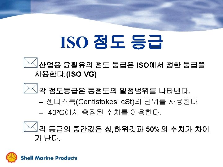 ISO 점도 등급 등급 2 3 5 7 10 15 22 32 46 68 100 150 220 320 460 680 1000 1500 중간점도 (c. St @ 40ºC) 2. 2 3. 2 4. 6 6. 8 10 15 22 32 46 68 100 150 220 320 460 680 1000 1500 최소 1. 98 2. 88 4. 14 6. 12 9. 0 13. 5 19. 8 28. 8 41. 4 61. 2 90 135 198 288 414 612 900 1350 점도 범위 최대 2. 42 3. 52 5. 06 7. 48 11. 0 16. 5 24. 4 35. 2 50. 6 74. 8 110 165 242 352 506 748 1100 1650
