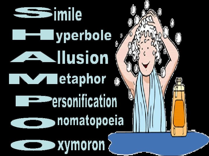 Figurative Language Matching WORD BANK: Simile Hyperbole Alliteration Metaphor Personification Onomatopoeia Oxymoron A. sound effect words B. compare two things without like or as; one thing is another. C. give a human qualities to an animal, object, or idea. D. Repetition of sounds E. comparison of two things using like or as. F. two words that contradict G. extreme exaggeration for emphasis.