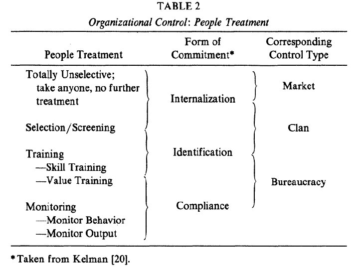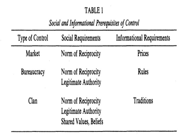 Table 3 the contingencies which determine whether or not measurement is possible Recent (1979) organization theorist have argued that few organizations process underlying rationality for market and bureaucratic forms of control; therefore the forms of control of today may be inappropriate for the future