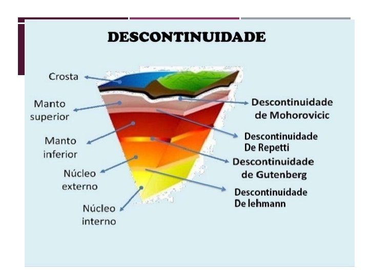 DESCONTINUIDADE DE CONRAD Crosta superior – composição granítica Crosta Inferior – composição basáltica Crosta Superior rochas magmáticas compostas por silicatos de alumínio e magnésio Crosta Inferior rochas metamórficas formadas especialmente por ferro e magnésio
