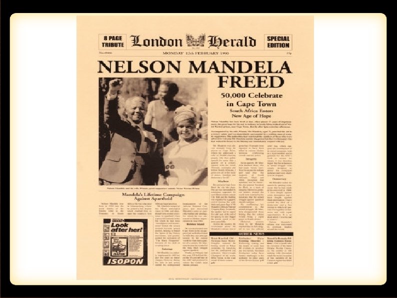 : : : África do Sul e o Apartheid : : : Em 1990, Nelson Mandela é libertado e o CNA recuperou a legalidade. Será eleito presidente em 1995 (até 1999). O governo revogou as leis raciais. 1993: primeira eleição multirracial do país. 1994: o parlamento aprovou a Lei de Direitos sobre a Terra, restituindo propriedades às famílias negras. Comissão de Reconciliação e Verdade (CRV): criada para investigar, esclarecer, julgar e anistiar crimes contra os direitos humanos durante o apartheid.