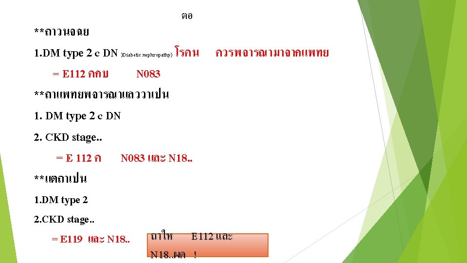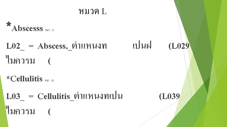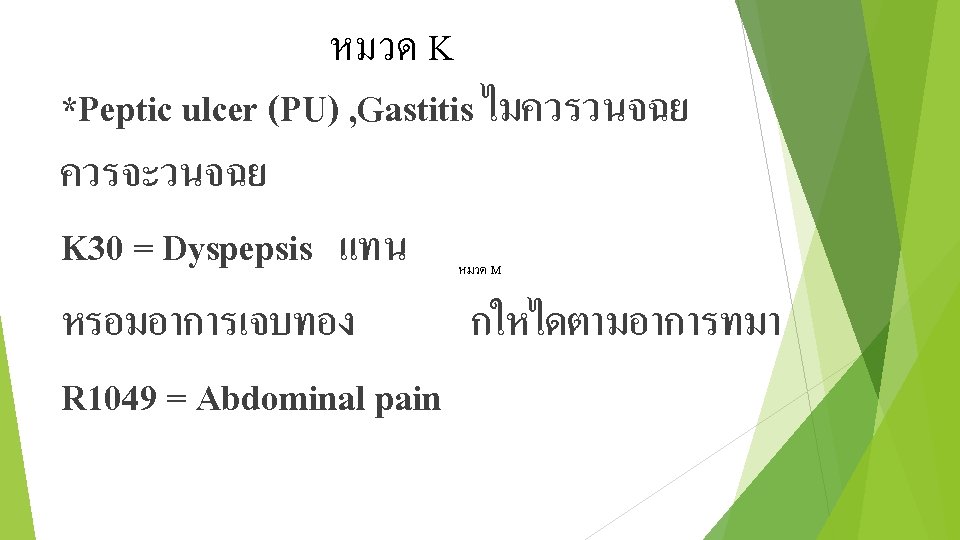 ตอ * โรคเกยวกบฟน K 029 = Dental caries K 050 = Acute gingivitis K 051 = Gingivitis K 088 = Toothache