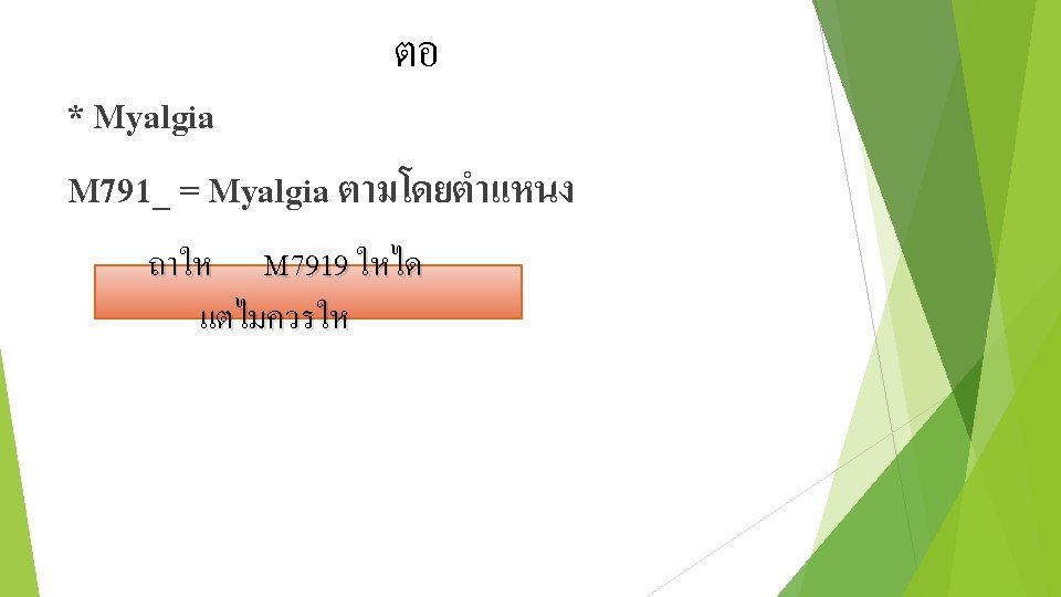 ตอ Muscle strain จะม 2กรณ. 1 Non traumatic ไมไดเกดจากอบตเหต M 626_ = Muscle strain. 2 Traumatic เกดจากอบตเหต S_3 XX = Muscle strain •