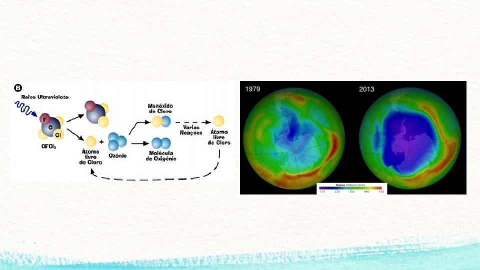 Estratosfera • Fica entre 12 e 50 km de altitude; • Rico em ozônio (O 3); • Filtra grande parte da radiação ultravioleta proveniente do Sol; • A utilização de clorofluorcarbonos (CFCs) em refrigeradores, aparelhos arcondicionado, aerossóis provocam a rarefação da camada de ozônio.