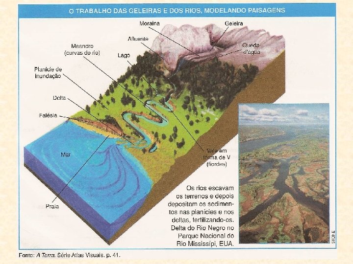 Agentes Externos • Entre esses agentes, destacam-se: – Rios. – Geleiras. – Ventos. – Mar. Obs. O intemperismo corresponde a um conjunto de ações químicas, físicos e biológicos que atuam no desgaste das rochas.