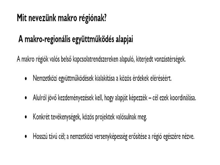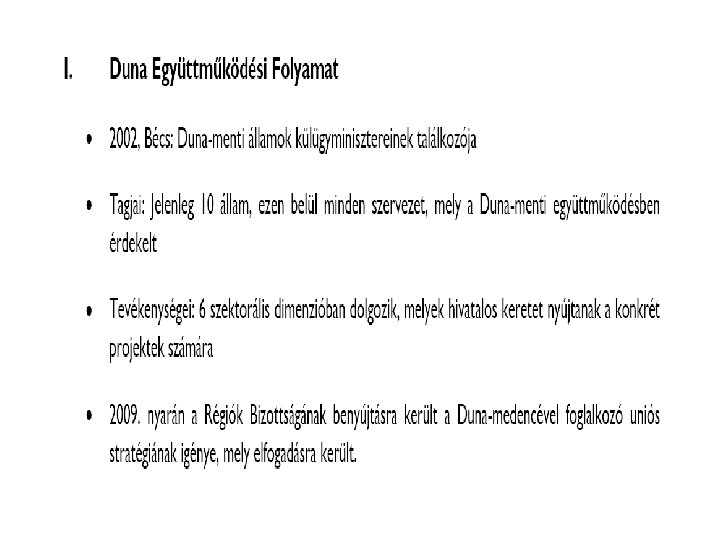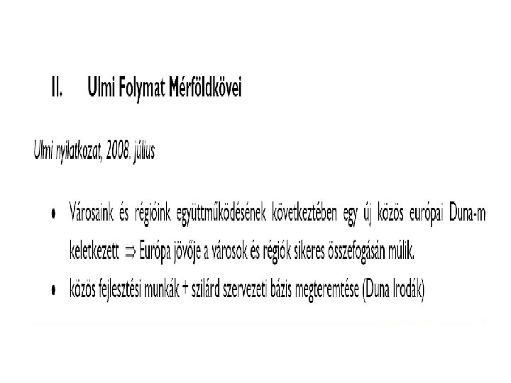 Stratégia • Biztonság: Természetvédelem, Energiaellátás, Katasztrófa megelőzés, Biztonságos-öko-élelmiszer term. • Fenntartható gazdaságfejlődés : – hajóút, és közlekedési-szállítási eszközpark fejlesztése (kikötők, logisztikai központok, ) – Közlekedési kapcsolatok, átjárhatóság létrehozása – Környezetbarát, tudásigényes ipar fejlesztés – Helyi erőforrásokra épülő KKV-fejlesztés ( termelés, szolgáltatás, turizmus) • Dunai-identitás és térségközi együttműködés – Társadalmi integráció, – Kutatás, oktatás, civil kapcsolatok, kulturális kapcsolatok , épített örökség megőrzése