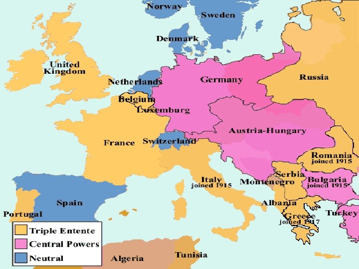 Antecedentes da I Guerra Mundial • Situação conflituosa – Tensão entre França, Inglaterra e Alemanha (que acabara de se centralizar, e consequentemente, queria novas colônias para fortalecer economicamente – NEOCOLONIALISMO) disputando novos mercados, tanto na Europa, quanto fora dela. – Ásia e África. – Cada país tentava dificultar a expansão econômica do outro.