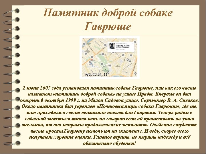 A monument to a kind dog Gavryusha On June 1, 2007 the monument to a dog of Gavrusha or as it is often called "a monument to a kind dog" was established on Pravda Street. The sculpture was done by sculptor Sivackov V. A. It is considered one of Petersburg's symbols of kindness and wishes fulfillment. Firstly, it was open on October 8, 1999 on Malaya Sadovaya Street and it even had its own "mailbox". Everyone could write a letter and ask Gavryusha to fulfill a wish. Now near the dog there isn’t the mailbox, but students often ask Gavryusha to help them at examinations. And after all, most likely receive good marks. The main thing to trust, not to lose hope and everything will surely come true!