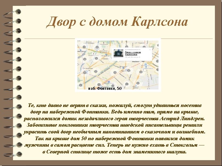 The yard with Carlson's house Those who don't believe in fairy tales, perhaps, will be surprised having visited the yard on Fontanka Embankment, house 50. Careful fans of the Swedish writer decided to decorate the yard with an unusual reminder about fantastic and magic. There is a little house on the top of the roof where a fabulous naughty hero of Astrid Lindgren Carlson settled down. Now it isn't necessary to go to Stockholm — in the Northern capital of Russia there is a house of the famous naughty child.